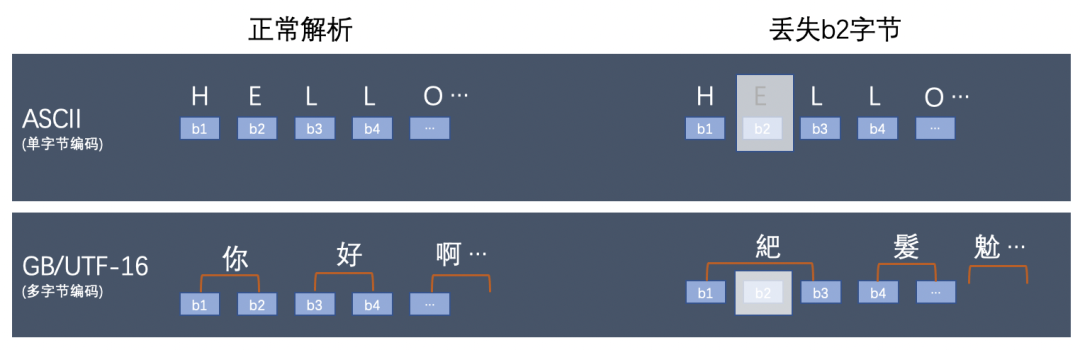 我们先来看下其他编码的容错情况,从对于单字节的ASCII码来说,丢失一个字节就丢失一个字符,并不影响后续文本的内容,比如Hello world,丢失b2字节后内容是Hllo world少个e而已