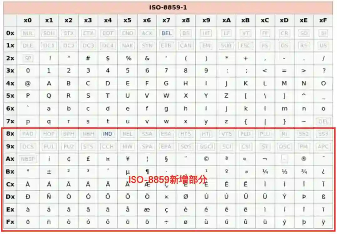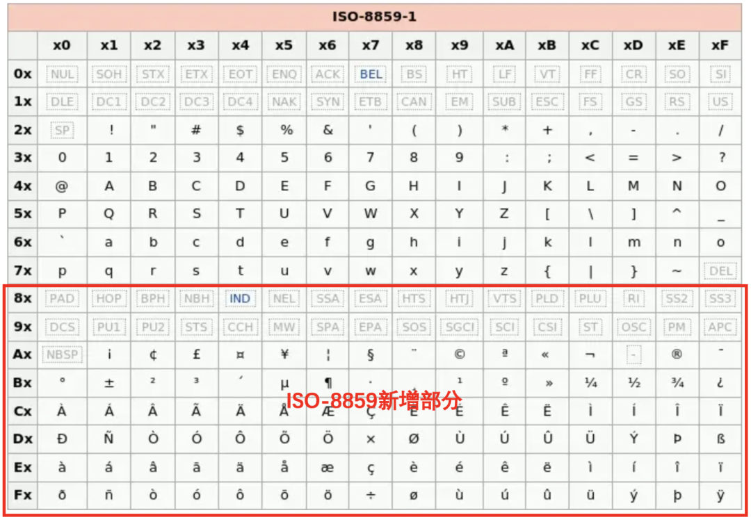 于是就有了大家所熟知的这个ISO-8859-1(Latin-1),它只是扩展了ASCII后128个字符,还是属于单字节编码;同时为了兼容原先的 ASCII码,当最高位是0的时候仍然表示原先的 ASCII 字符不变,当最高位是1的时候表示扩展的欧洲字符。