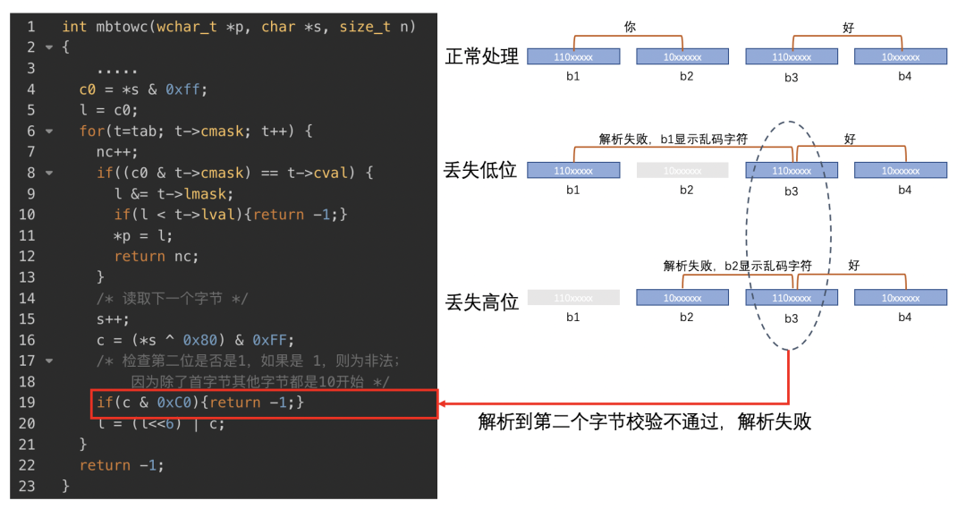 用文字不太好描述算法结构,我们就直接来欣赏一下UTF-8鼻祖写的这段解析代码,这是Ken 和 Rob 用一个晚上写出来的编解码算法,代码非常简短精炼,为了方便阅读我加了注释解读。
