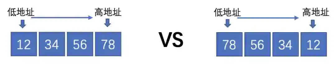 为了方便说明,我们这里举个例子,比如存一个整数值「305419896」对应16进制是0x12345678,有人习惯从左到右按顺序去存,也有人说高位当然要放到高位地址而低位放到低位地址,要从右往左存。于是就有了下面两种存取方式。
