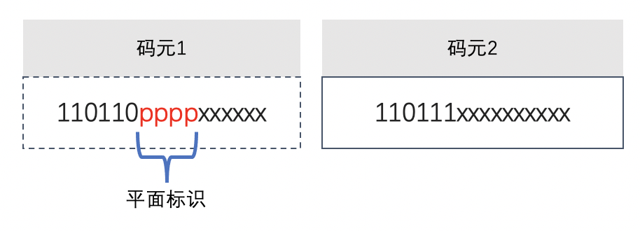 增补平面的编号是采用双码元4个字节来表示的,去除代理对之后有效位数是20位,然后将这20位的编号再划成16个平面区域,其中高半区的数字位里取出4位表示平面,剩下的16位表示每个平面可以表示的字符数也就是2的16次方65536个(两个字节大小)