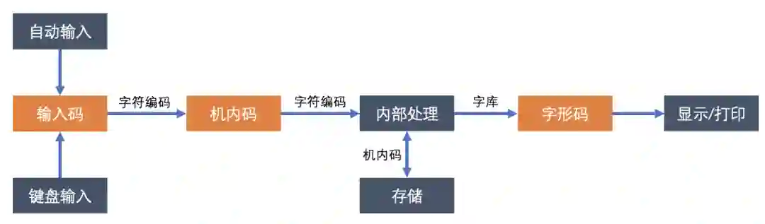 但是对于汉字输入就不是这么回事了,键盘上可没有汉字对应的输入按键,我们不可能直接敲出汉字字符。于是就有了输入码、机内码、字形码的转换关系,输入码帮助我们把英文键盘按键转换成汉字字符,机内码帮助我们把汉字字符转换成二进制序列,字形码帮助我们把二进制序列输出到显示器成像。