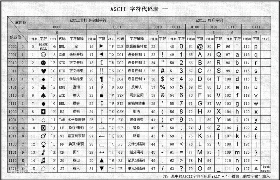 其中前 32 个(0~31)是不可见的控制字符,32~126 是可见字符,127 是 DELETE 命令(键盘上的 DEL 键)。