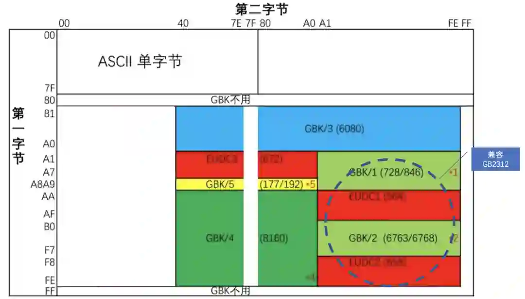 GBK 整体编码范围为 8140-FEFE,首字节在 81-FE 之间,尾字节在 40-FE 之间,剔除 xx7F 一条线,总计 23940 个码位,共收入 21886 个汉字和图形符号;其中 GBK/1 收录除 GB 2312 字符外的其他增补字符,GBK/2 收录 GB2312 字符,GBK/3 收录 CJK 字符,GBK/4 收录 CJK 字符和增补字符,GBK/5 为非中文字符,UDC 为用户自定义字符。