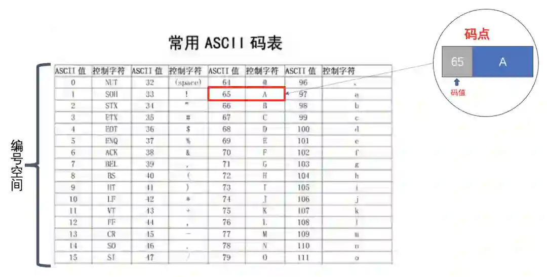 这其实就是我们按照一定的规则维护了字符-数字的映射关系,比如我们把「A」抽象成计算机中的「1」,当我们看到1的时候就认为这是「A」,本质上就是一张映射表,理论上你可以随意给每个字符分配一个独一无二的编号(character code,字符编码),比如下表