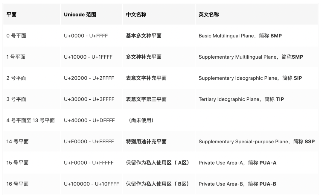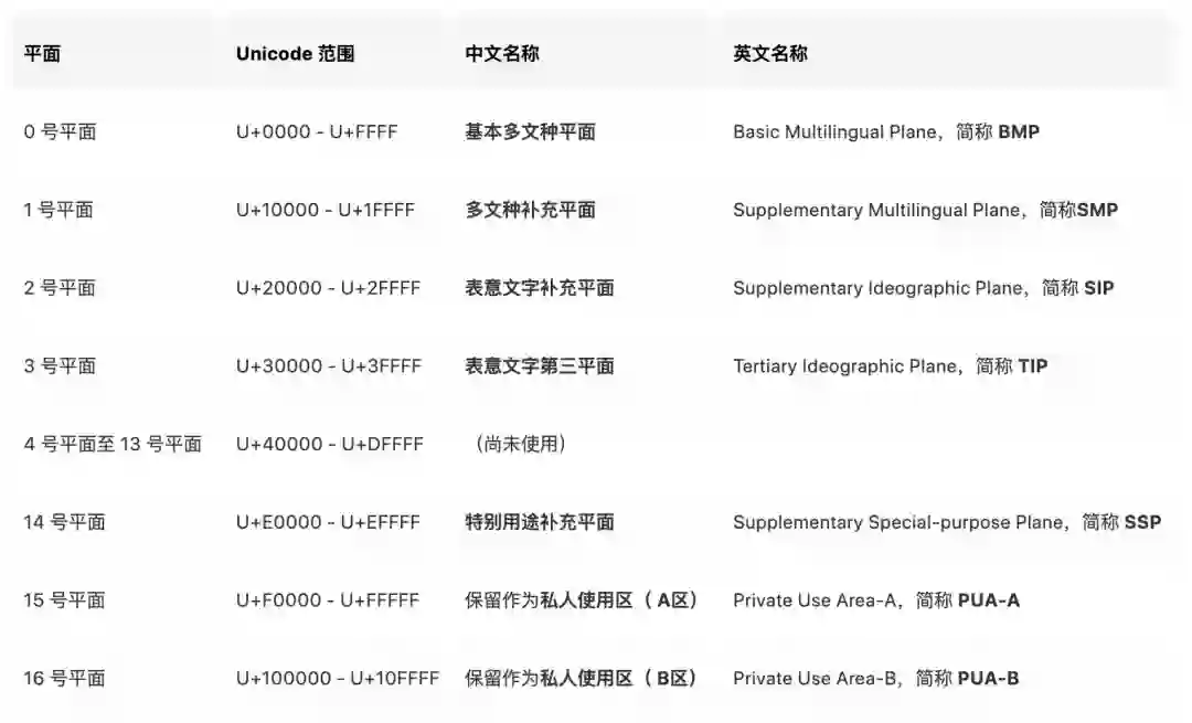 UTF-16把编码空间0000 ~ 10FFFF切成了17个平面,其实就是划分成17个区块,每个平面空间码点数都是=65536个,第一个平面称为基本多语言平面(Basic Multilingual Plane,简称BMP),这个平面涵盖了当今世界上最常用的字符,固定使用定长两个字节,除此之外的字符都放到增补平面里,都是使用两个码元的定长4个字节,下面是各个平面的用途