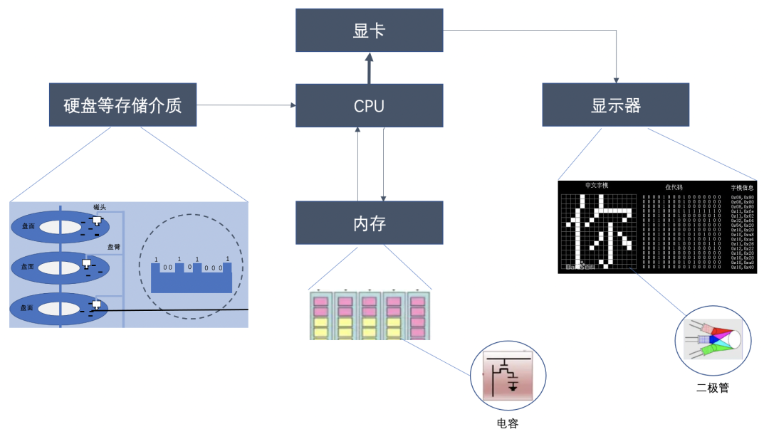 同样内存里你也找不到二进制数字,内存放大了看就是一堆电容组,内存单元存储的是「0」还是「1」取决于电容是否有电荷,有电荷我们认为他是「1」,无电荷认为他是「0」。但是电容是会放电的,时间一长,代表「1」的电容会放电,代表「0」的电容会吸电,这也是我们内存不能断电的原因,需要定期对电容进行充电,保证「1」的电容电量有电。