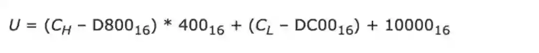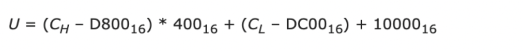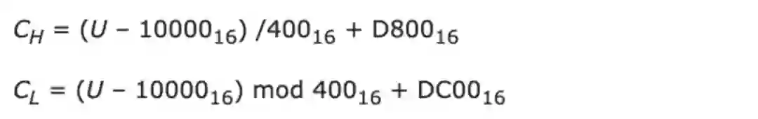 当UTF-16使用一个码元表示的时候,Unicode字符编号跟码元序列是等值映射的,但是当采用双码元后,字符编号跟码元序列就需要转换了,下面是码元和Unicode编号值之间的计算公式: