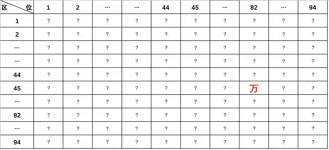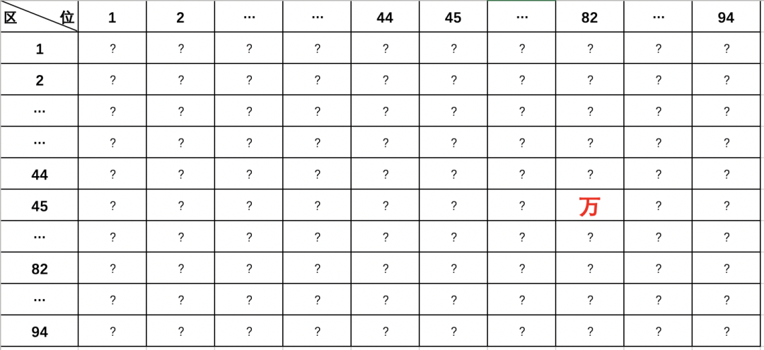 下图是区位码的二维表,比如「万」字是45 区 82 位,所以「万」 字的区位码是「45,82」。