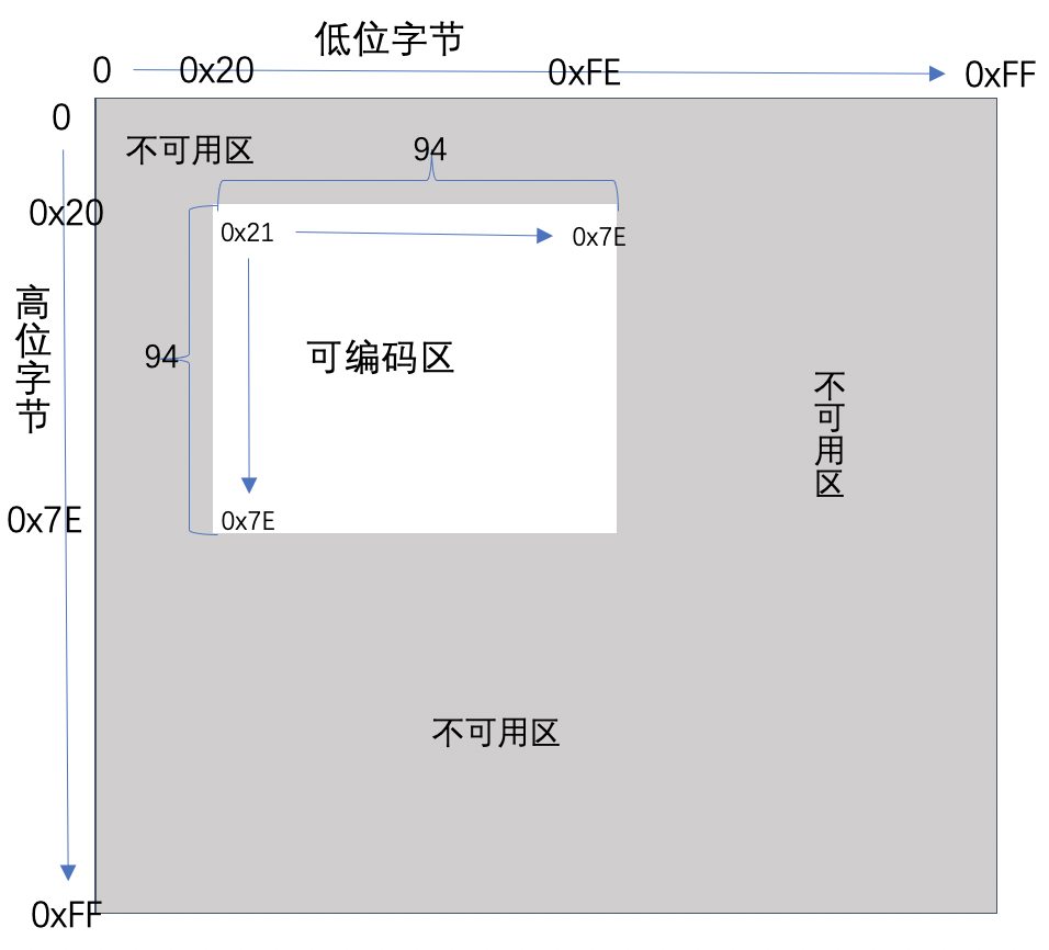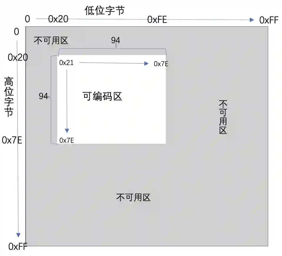 由于上述国标码的16进制可编码区不够直观不方便我们使用,所以我们把他映射成了十进制的94*94二维表编号空间,我们称之为区位码,同时区位码也可以当成一种外码使用,输入法可以直接切换成区位码进行汉字输入,不过这种输入法无规则可言 人们很难记住区位编号,用的人也不多了。