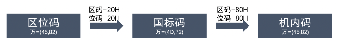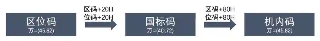 总结下三者转换关系:区位码 ---> 区码和位码分别 + 32(即 + 20H )得到国标码 ---> 再分别 + 128(即 + 80H)得到机内码(与 ACSII 码不再冲突)