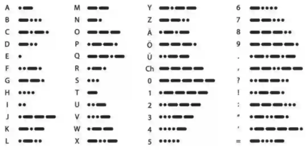 摩尔斯电码是由美国人摩尔斯在1837年发明的,比起ASCII还要早100多年,在早期的无线电上作用非常大,它是每个无线电通讯者需必知的,它的是由点dot「.」和划dash「-」这两种符号所组成的,电报中表达为短滴和长嗒,跟二进制一样也是二元码。一个二元肯定不够表示我们的字母,那么就用多个二元来表示,比如嘀嗒「.-」代表字母「A」,嗒嘀嘀嘀「-...」代表字母「B」。