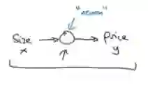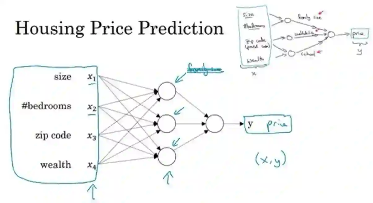 在图上每一个画的小圆圈都可以是 ReLU 的一部分,也就是指修正线性单元,或者其它稍微非线性的函数。基于房屋面积和卧室数量,可以估算家庭人口,基于邮编,可以估测步行化程度或者学校的质量。最后你可能会这样想,这些决定人们乐意花费多少钱。