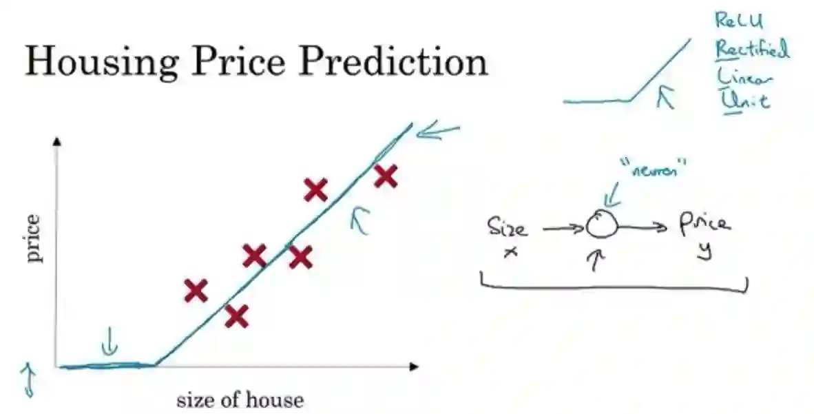 作为一个神经网络,这几乎可能是最简单的神经网络。我们把房屋的面积作为神经网络的输入(我们称之为 x),通过一个节点(一个小圆圈),最终输出了价格(我们用 y 表示)。其实这个小圆圈就是一个单独的神经元。接着你的网络实现了左边这个函数的功能。在有关神经网络的文献中,你经常看得到这个函数。从趋近于零开始,然后变成一条直线。这个函数被称作 ReLu 激活函数,它的全称是 Rectified Linear Unit。rectify(修正)可以理解成 max(0,x),这也是你得到一个这种形状的函数的原因。