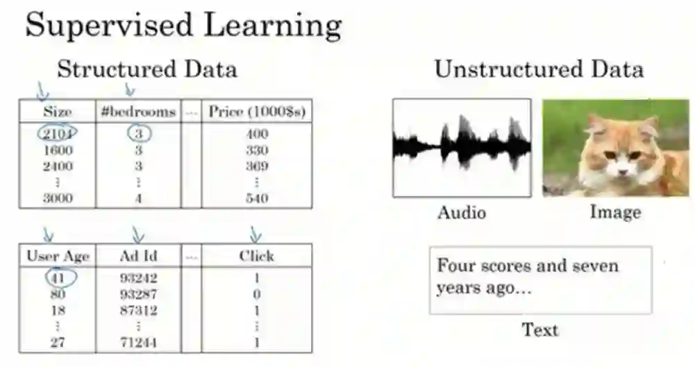你可能也听说过机器学习对于结构化数据和非结构化数据的应用,结构化数据意味着数据的基本数据库。例如在房价预测中,你可能有一个数据库,有专门的几列数据告诉你卧室的大小和数量,这就是结构化数据。或预测用户是否会点击广告,你可能会得到关于用户的信息,比如年龄以及关于广告的一些信息,然后对你的预测分类标注,这就是结构化数据,意思是每个特征,比如说房屋大小卧室数量,或者是一个用户的年龄,都有一个很好的定义。相反非结构化数据是指比如音频,原始音频或者你想要识别的图像或文本中的内容。这里的特征可能是图像中的像素值或文本中的单个单词。
