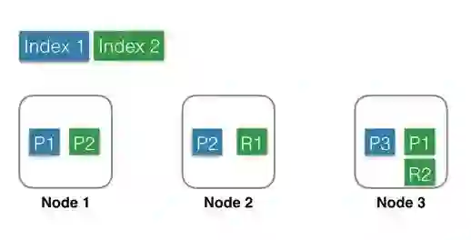 Index 2:绿色部分,有 2 个 Shard,分别是 P1,P2,位于 2 个不同的 Node 中。并且每个 Shard 有一个 Replica,分别是 R1 和 R2。