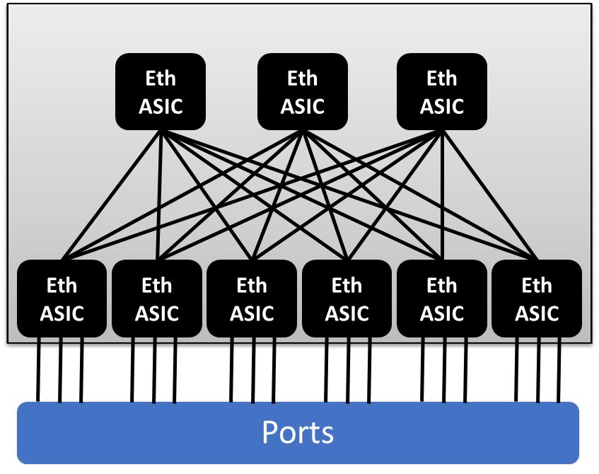 传统的Chassis Switch架构其实是由多个交换机芯片构成的(见图3示例)。前端芯片和后端芯片是靠一个特殊的基于Cell(交换机芯片内部一种固定长度的数据单元)交换(Cell Switching)的无损(Lossless)网络连接起来的。目前,Chassis Switch内部的Cell网络并没有公开的拓扑和路由标准。不同芯片厂商的Chassis Switch内部Cell网络的实现也不尽相同,且细节并不公开,可以说是不折不扣的黑盒子。在这种不透明的情况下,网管们很难用SONiC来管理Chassis Switch,也无法发现和诊断Chassis内部出现的网络问题。