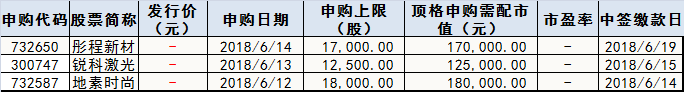 根据目前已披露信息显示,下周将有三只新股进行IPO,其中沪市2只,创业板1只。这3只新股分别为周二(6月12日)地素时尚,周三(6月13日)锐科激光及周四(5月14日)彤程新材。