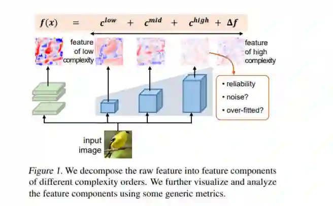 基于此,本项研究提出了一种对神经网络中层“特征复杂度”的通用量化指标,这一方法能够将神经网络中层特征拆分成不同阶次的复杂度分量。通过对不同复杂度特征分量的可视化,人们可以更清晰地分析不同复杂度分量的语义;同时,本研究也提出了数学指标以分析不同复杂度分量的可靠性、有效性、以及过拟合程度。作为一种通用指标,本项研究也可以为深度学习中的一些经典方法提供全新角度的解释。