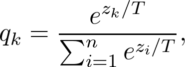 其中,T是一个超参数,称为温度。这些值叫做soft targets。
