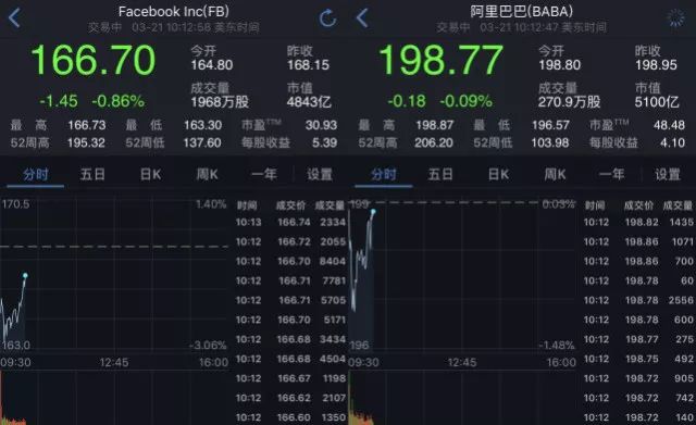 在经过连续下跌之后,Facebook市值被阿里巴巴成功超越。截止北京时间22时13分,Facebook股价下跌0.86%,报166.70美元,市值为4843亿美元,阿里巴巴股价下跌0.09%,报198.77美元,市值5100亿美元。而在过去几个交易日里,受数据泄密丑闻影响,Facebook先后遭遇两连跌,周一股价重挫7%之后,周二收盘再跌2.56%。