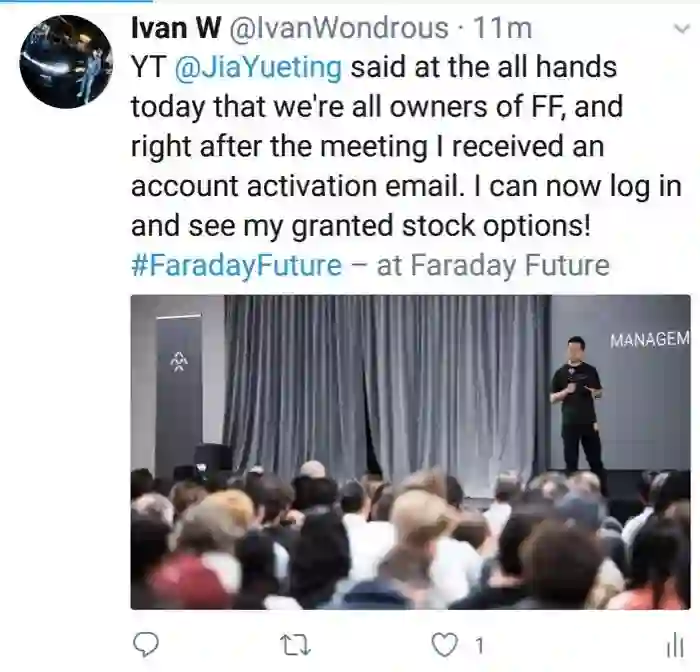 此外,有FF员工透露,FF此前承诺的全员股权激励也正式落地,当天FF开通了股权激励系统,员工可通过系统查询股权激励情况。