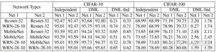 一般来说小网络从互学习训练中获益更多,比如Resnet-32和MobileNet。尽管WRN-28-10网络参数量很大,与其它网络进行互学习训练依然可以获得性能提升。因此,不同于模型蒸馏算法需要预训练大网络来帮助小网络提升性能,我们提出的深度互学习算法也可以帮助参与训练的大网络来提升其性能。