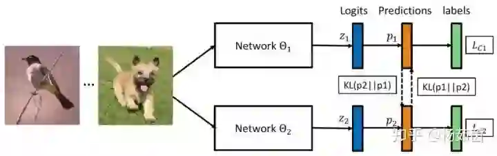 Hinton等人在2015年提出的模型蒸馏算法,利用预训练好的大网络当作教师来向小网络传递知识,从而提高小网络性能。而模型蒸馏算法需要有提前预训练好的大网络,且仅可对小网络进行单向的知识传递。古人云“三人行必有我师焉”,本文作者提出了一种“深度互学习Deep Mutual Learning”策略,使得小网络之间能够互相学习共同进步。