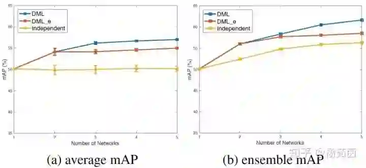 针对多网络互学习,我们从图3看出增加网络数量可以提升互学习策略下的单个网络性能,这说明更多教师网络提供了更多学习经验,帮助网络学习到更好的特征。另一方面,多网络互学习中多个独立教师(DML)的性能会优于融合教师(DML_e),这说明多个不同教师网络可以提供更多样化的学习经验,更有益于每个网络的学习。