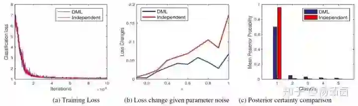 为了验证该猜想,我们对两种策略训练好的网络参数添加高斯噪声,并在图(b)中比较了添加不同方差高斯噪声后网络损失函数值的变化。从图中可以看出,单独训练的网络在添加噪声后损失函数值波动很大,而互学习训练网络的损失函数值则增加很小。该实验现象表明深度互学习算法帮助网络找到了一个更平缓的极小点,针对噪声具有更强的鲁棒性,从而具有更好的泛化性能。
