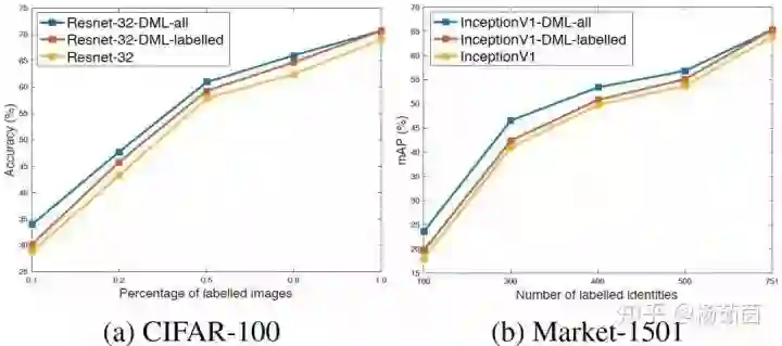 我们提出的互学习算法也很容易扩展到多网络学习和半监督学习场景中。当有K个网络时,深度互学习学习每个网络时将其余K-1个网络分别作为教师来提供学习经验。