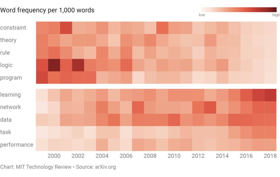 我们《麻省理工学院科技评论》杂志(MIT Technology Review)想要直观地呈现这些变化。于是,我们将目光投向最庞大的科学论文开源数据库之一:arXiv。我们下载了2018年11月18日之前归属“AI”部分的所有16625篇论文的摘要,跟踪分析了这些年来提及的单词,看看这个领域是如何演变的。