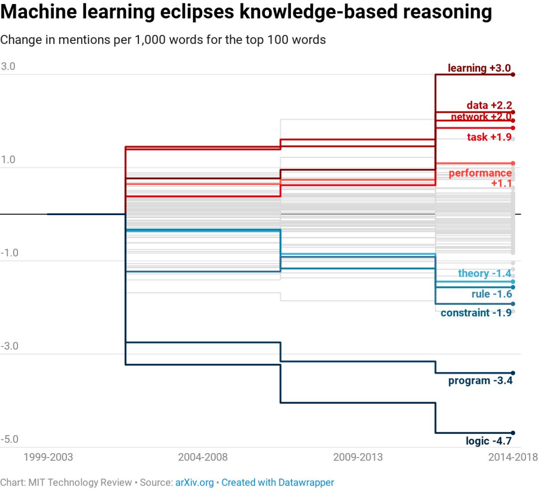 在提及的前100个单词中,与基于知识的系统相关的那些单词(比如“逻辑”、“约束”和“规则”)跌势最猛。而与机器学习有关的那些单词(比如“数据”、“网络”和“性能”)增势最猛。