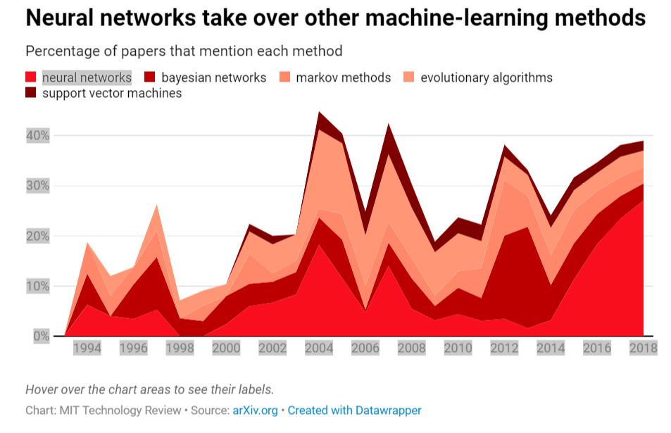 在新的机器学习范式下,并没有立即出现向深度学习转变的一幕。相反,正如我们对关键术语的分析显示的那样,除了深度学习的核心机制神经网络外,研究人员还测试了众多方法。另外一些流行的技术包括贝叶斯网络、支持向量机和进化算法,所有这些技术都采用了不同的方法来查找数据中的模式。