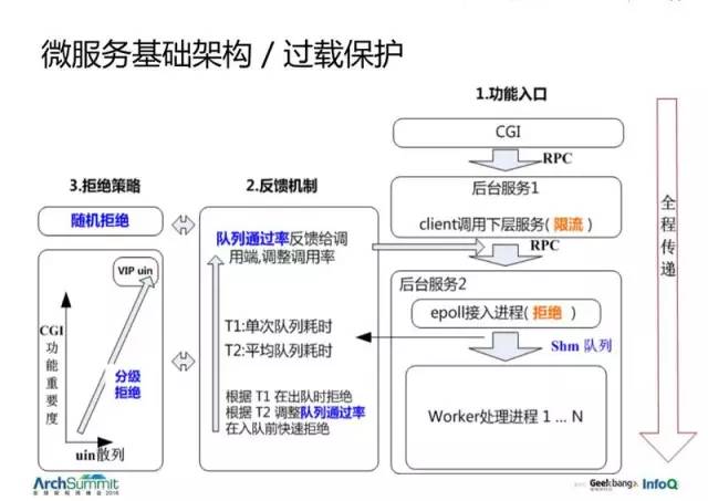 整个系统基于反馈,然后它把整个拒绝的信息全程传递了。看到最右边,有几个典型的服务,从一个 CGI 调用一个后台服务,再调用另一个后台服务,它会在 CGI 层面就把它的重要程度往下传。回到刚才那个前端调用 A、B 服务的例子,使用这样的一种重要程度传递,就可以直接拒绝那些相同用户的 20% 的请求,这样就解决了这个问题。