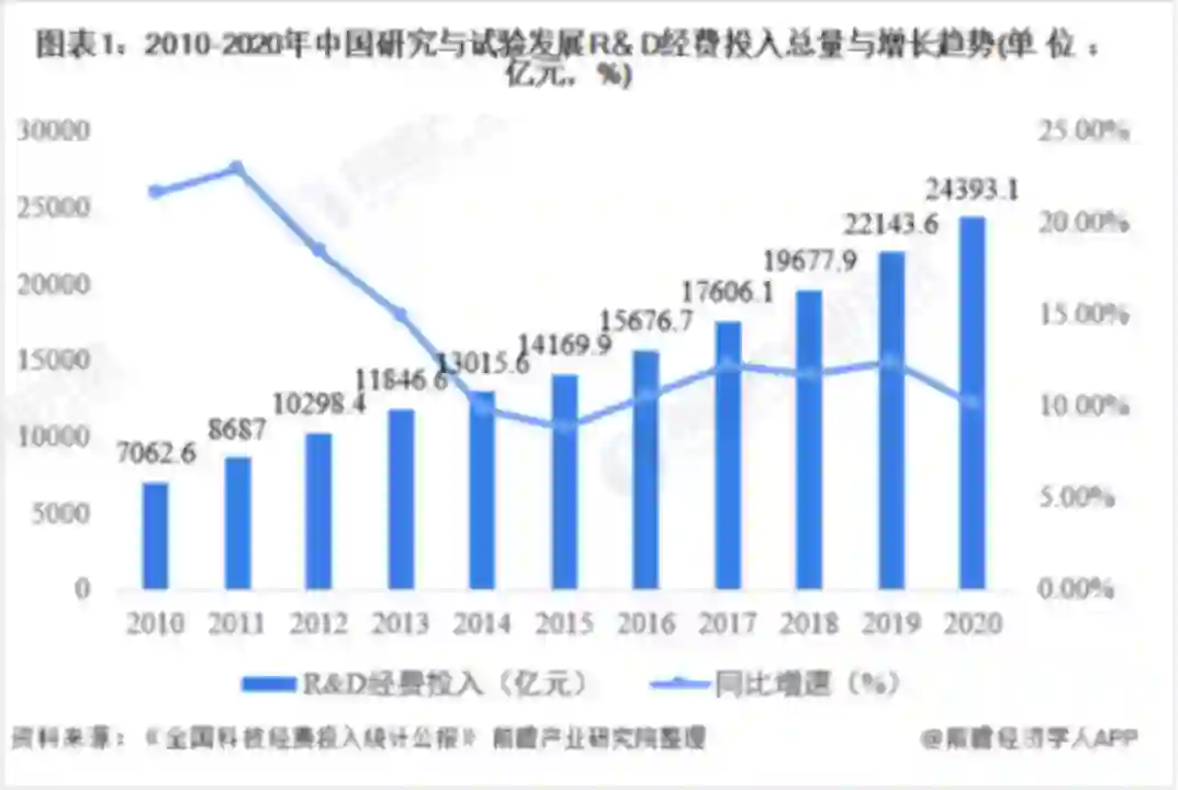 资金方面。根据全国科技经费投入统计公报的数据,2010-2020年,我国科技经费投入继续保持增长态势,2020年,全年研究与试验发展(R&D)经费投入24393.1亿元,同比增长10.2%,与国内生产总值之比为2.40%。总量世界第二,增速领跑全球。