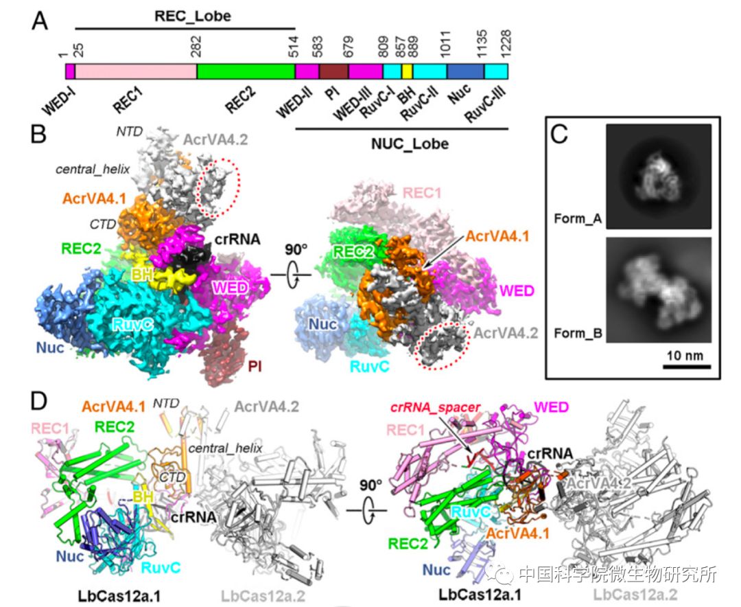 结构显示AcrVA4以同源二聚体形式存在,并且与一个或两个LbCas12a-crRNA二元复合物进行结合。