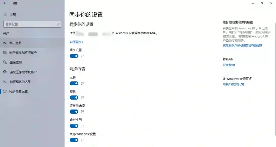 有的人可能不知道,其实 Windows 10 是支持通过 Microsoft 账号来同步系统设置的。可同步的内容包括了桌面壁纸、磁贴位置等个性化设置,Wi-Fi 配置文件、浏览器设置等密码和网络设置,语言首选项和轻松访问设置等。你可以在「设置 - 帐户 - 同步你的设置」中查看并修改相应的设置选项。