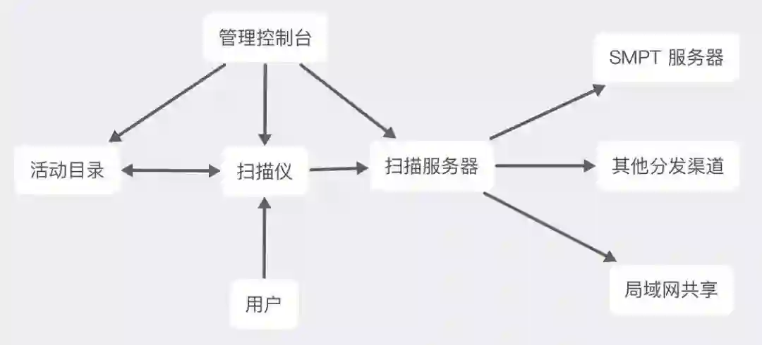 以下面这张流程图为例,扫描管理控制台可以用于检测及控制网络扫描仪,并在活动目录创建扫描进程。网络扫描仪所扫描的电子文档会传输至扫描服务器进行处理,并将其传输到其他服务器(比如局域网共享、SMTP 服务器等)进行文档的分发操作。