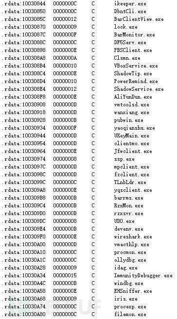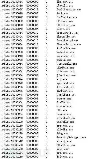 调试工具和安全监控软件的检测名单: