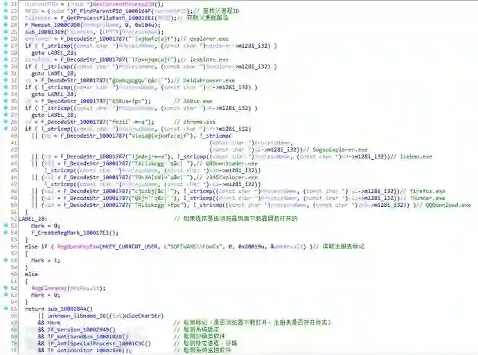 Mint母体通过注册表、文件和进程关系,检测是否沙箱/虚拟机/调试/杀软环境,是否浏览器或下载器启动;不是的话才执行恶意代码,否则只调起安装界面。