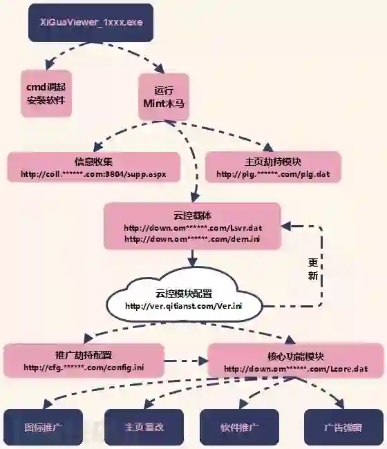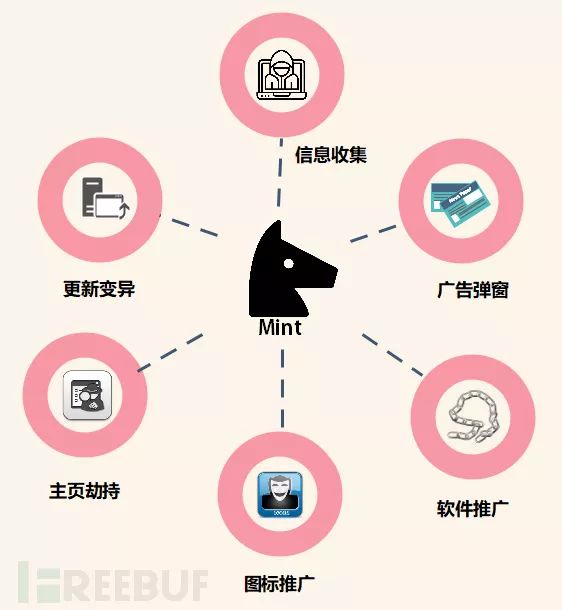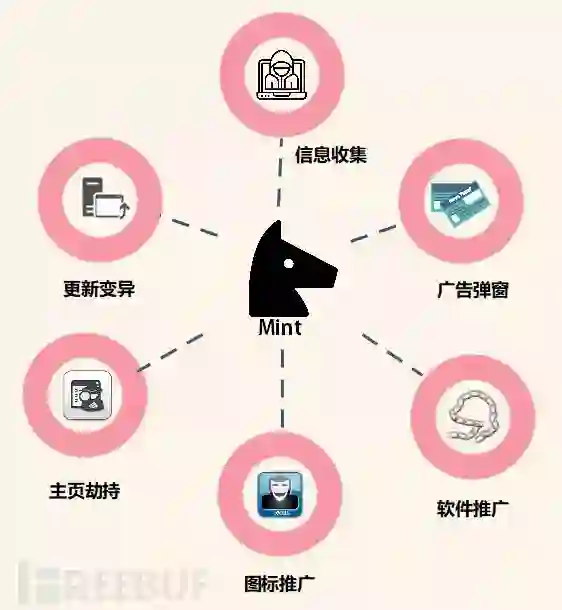 Mint 云控木马主要为6个功能:信息收集,广告弹窗,软件推广,图标推广,主页劫持,更新变异。