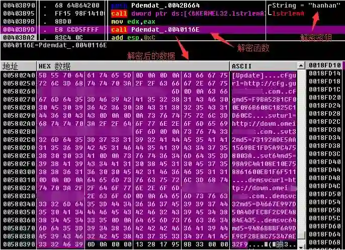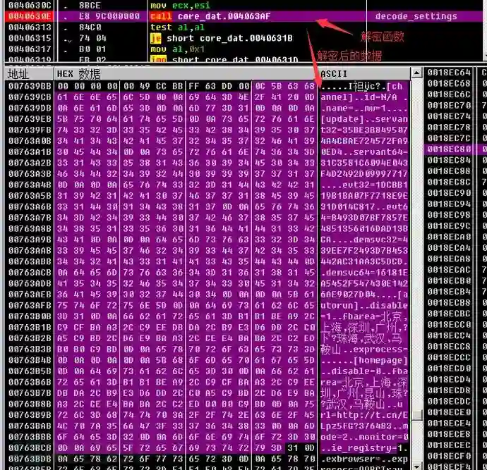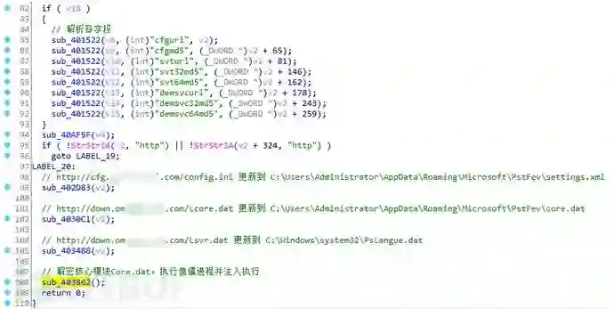 接着云控载体进行字段解析并更新插件模块和推广配置文件,将核心模块core.dat解密并注入到傀儡进程中执行: