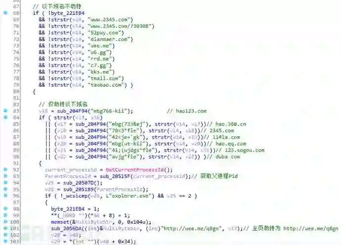 通过BHO机制劫持IE浏览器主页为http://uee.me/q8gn(跳转后最终为2345网址导航)。
