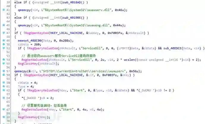 云控载体从模块配置文件Ver.ini中获取最新载体的下载地址(http://down.om*******.com/Lsvr.dat),保存为PsLangue.dat,然后解密还原成PE文件,复制到系统目录下,随机命名,并通过劫持wuauserv系统服务的方式,实现自更新和启动。