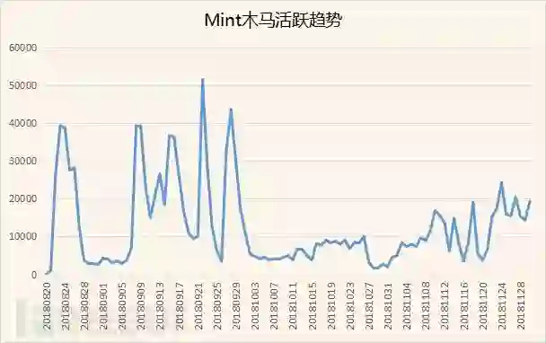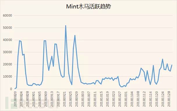 通过“捕风”威胁感知系统的监控到,Mint木马家族8月中旬开始爆发;9月中旬活跃达到峰值,感染用户量达5W/天;10月之后活跃降低,近期又逐渐活跃起来。