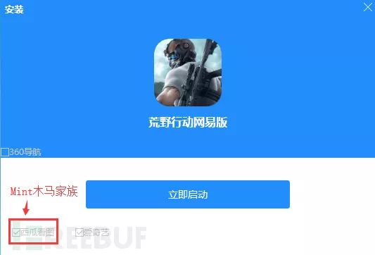 “蜻蜓助手”安装完毕后,会默认勾选“西瓜看图”(Mint木马家族的母体),用户如稍有不慎点击“立即启动”就会被植入木马软件。