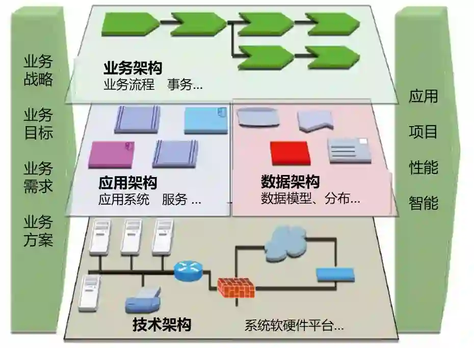 经典的企业架构中,不同的企业架构框架理论虽然角度不同,但是他们对企业架构内容的层次划分大体上还是一致的,基本上都是从如下几个方面(或至少包含如下几个方面)对企业架构进行描述: