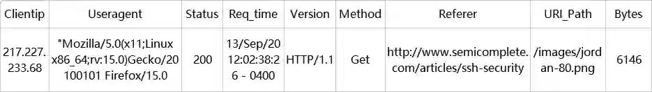 为了便于我们后续的数据分析,我们需要将其中难于分析的非结构化数据转换成结构化的数据加以存储。例如图1-3是在Apache Web日志中的一行记录,其中蕴含着会有大量有用的信息,如客户的IP、客户所使用的客户端,它访问的页面信息、访问时间等关键信息。