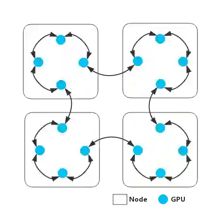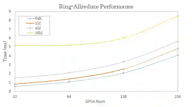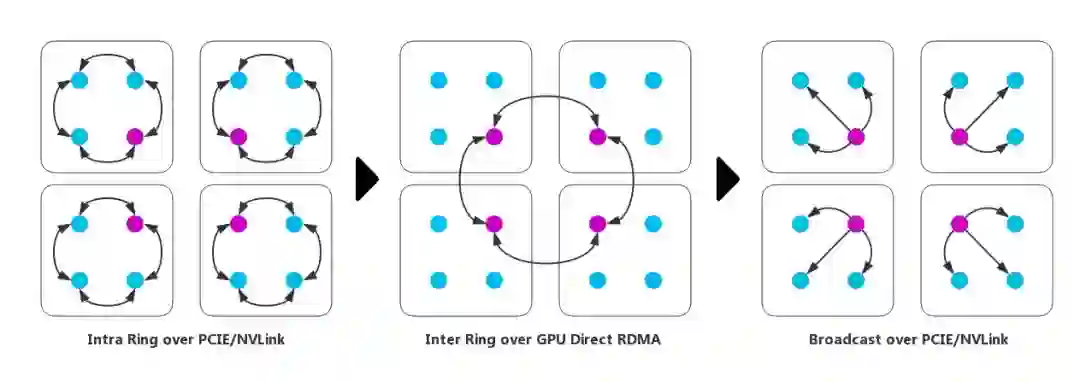 (3) GDR技术加速Ring Allreduce:在前述方案的基础上,将GDR技术应用于跨节点Ring,这减少了主存和显存之间的Copy操作,同时为GPU执行规约计算提供了便利;